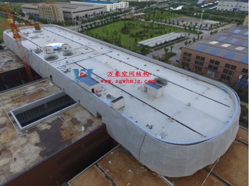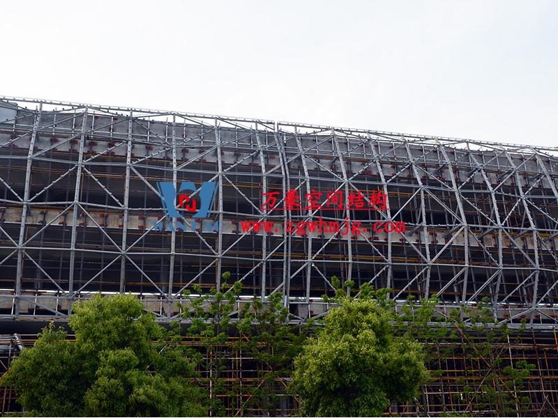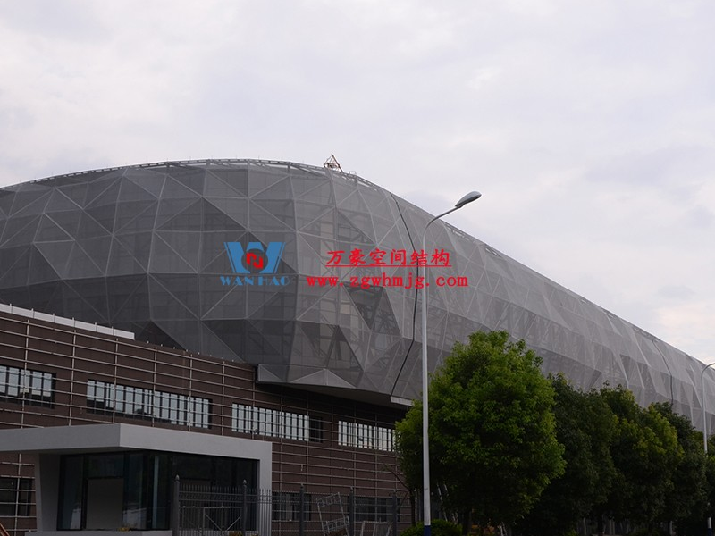 寧波菲仕展廳外立面網格膜結構項目,方案由意大利著名建筑師設計,設計靈感取鉆石之意。為了實現(xiàn)多變的設計效果,整個外立面采用了8000根形狀各異的鋼構件,每根桿件單獨編號、定位,實施難度極大。外層使用PTFE網格膜,樹立了PTFE網格膜使用的新標桿。用鋼量880噸,PTFE膜展開面積12660平方。