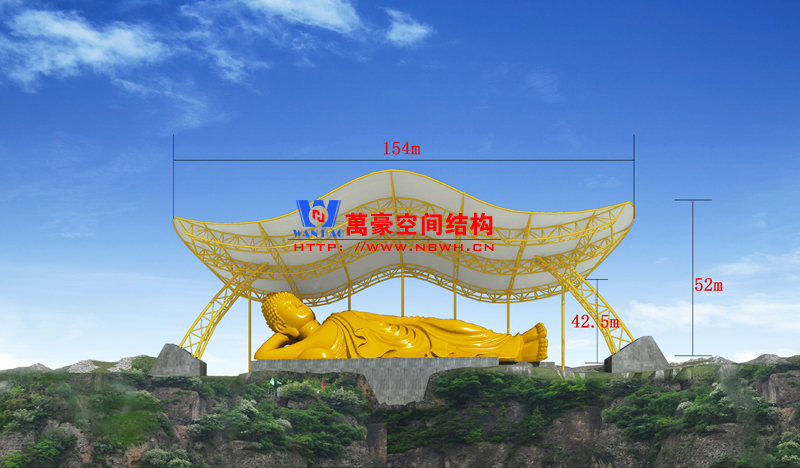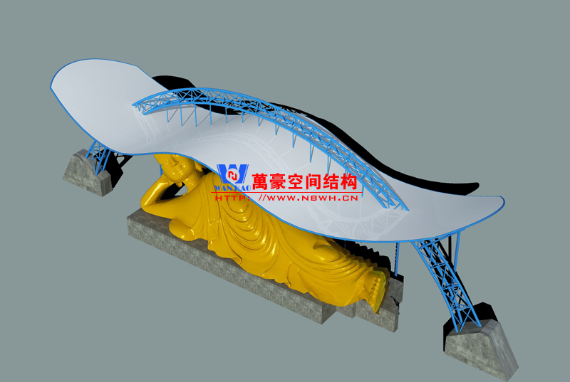 橫店釋伽牟尼大佛膜結構雨棚位于橫店影視城內,主要是給大佛加一個雨棚,起到遮陽擋雨的作用,讓釋伽牟尼佛像減少自然環境的侵蝕。以上就是大佛膜結構雨棚的效果圖,大家可以看一下。