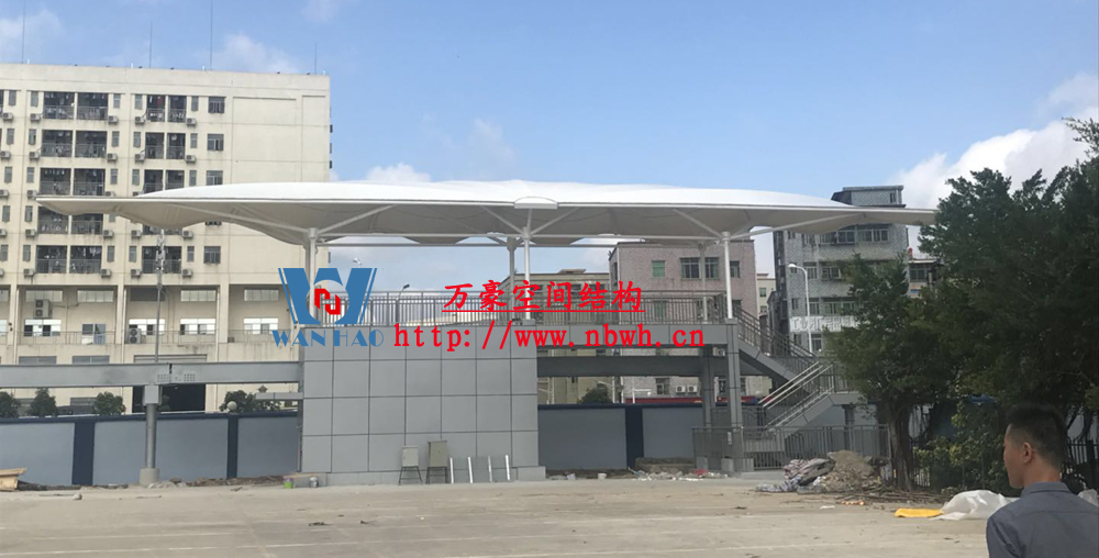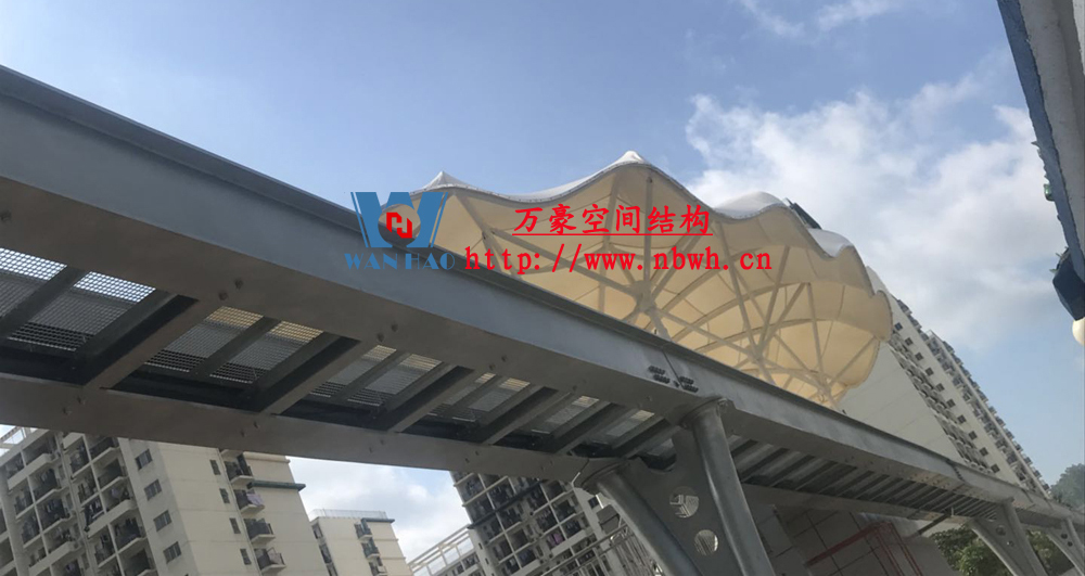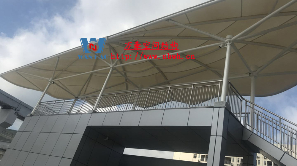云巴園區試驗示范線膜結構工程-四角站(原名:坪山一期生產園區C型線云軌站)位于深圳市坪山區比亞迪路3009號比亞迪股份有限公司園區四角大廈西面,該工程用鋼量50噸,膜材展開面積2000平方米,遮蓋材質選用最為優質的ETFE膜材(日本旭硝子),鋼構則選用了起拱和各種大小圓弧相融合。