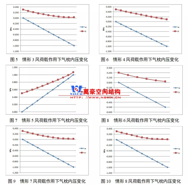 根據上一章節中列出的8個情形,在本章給出了在不同風荷載值下的氣枕內壓值,以圖表的形式: