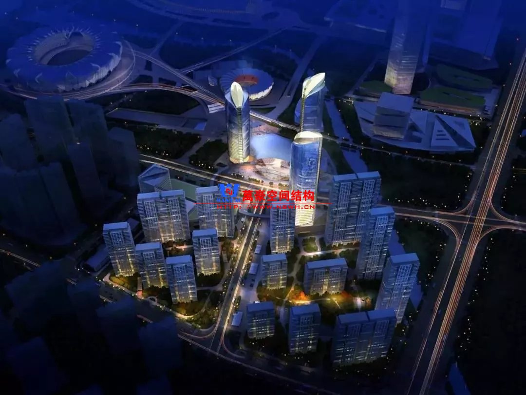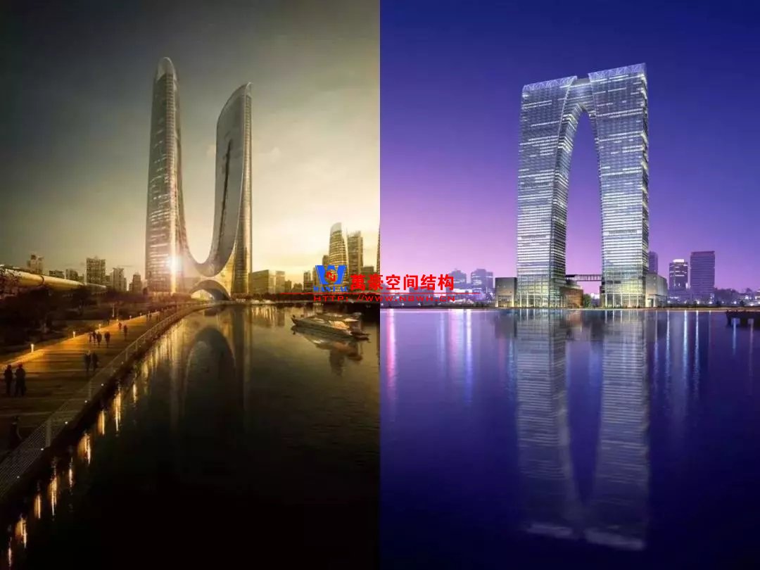 兩棟塔樓之間的底部跨度約60米,中間由約22米的鋼結(jié)構(gòu)拱連橋相接。