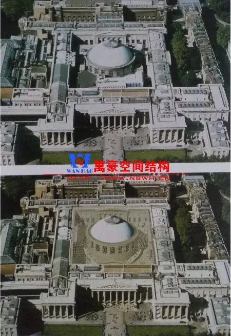 這個經(jīng)典的改造項目把輕與重巧妙組合。鋼結構網(wǎng)殼內(nèi)側(cè)支承于圓形閱覽室,外側(cè)支承于方形博物館建筑的內(nèi)墻,通過找形分析得到一個拱起的規(guī)則形態(tài)。