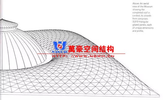 沿中心圓徑向布置主受力網(wǎng)格,再輔助另兩個方向的圓弧線條劃分出1656個三角形平面玻璃板。