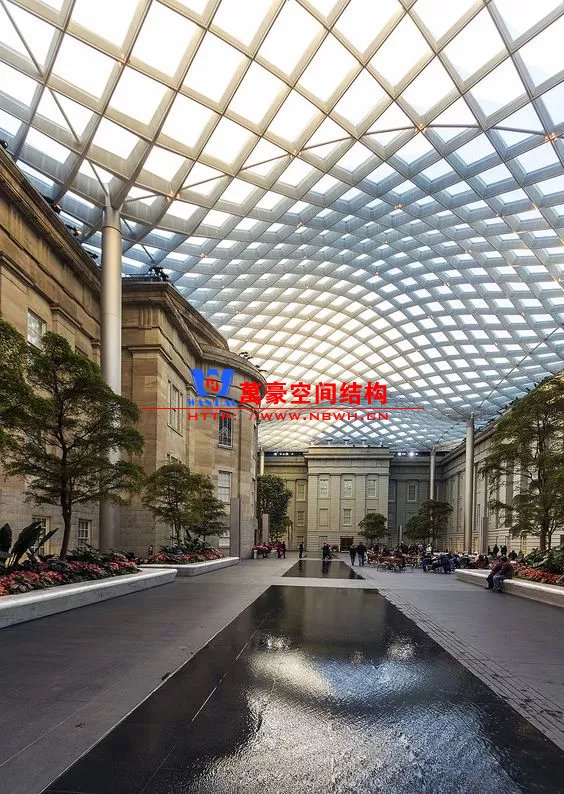 原有博物館建筑為天幕提供了一個堅固的邊界條件,使得網(wǎng)殼可以充分發(fā)揮形體的作用。構件以軸力為主、截面纖細,極大地突出了整體通透明亮的建筑效果。