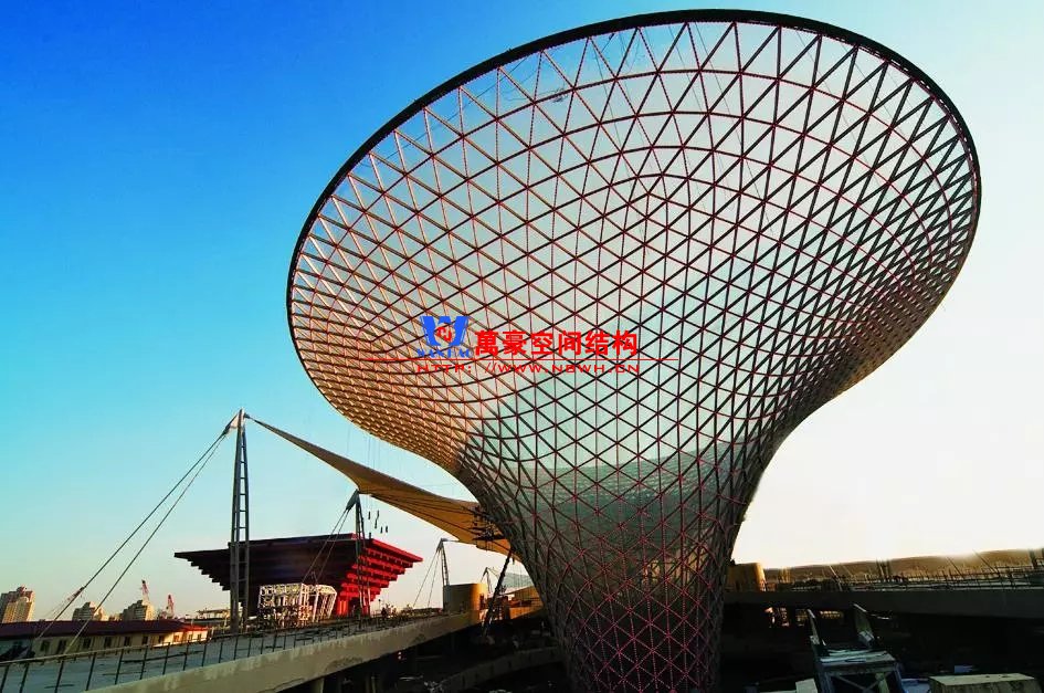 規(guī)則曲面的天幕一般采用鋼結構網(wǎng)殼形式,利用網(wǎng)殼曲面的形抗原理,結構以軸向受力為主、效率高,以較小的截面尺寸即可實現(xiàn)很大跨度。這一類網(wǎng)殼曲面多為圓柱面、球面。