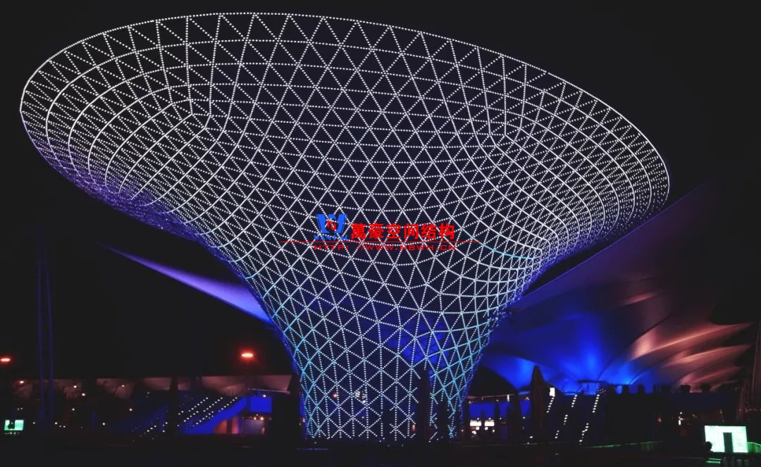 有的天幕雖然設計為曲面,但其曲面形狀的力學性能差,結構受力仍然以抗彎為主。這類曲面天幕結構與樹形柱相結合,才能以較細小的結構構件完成。