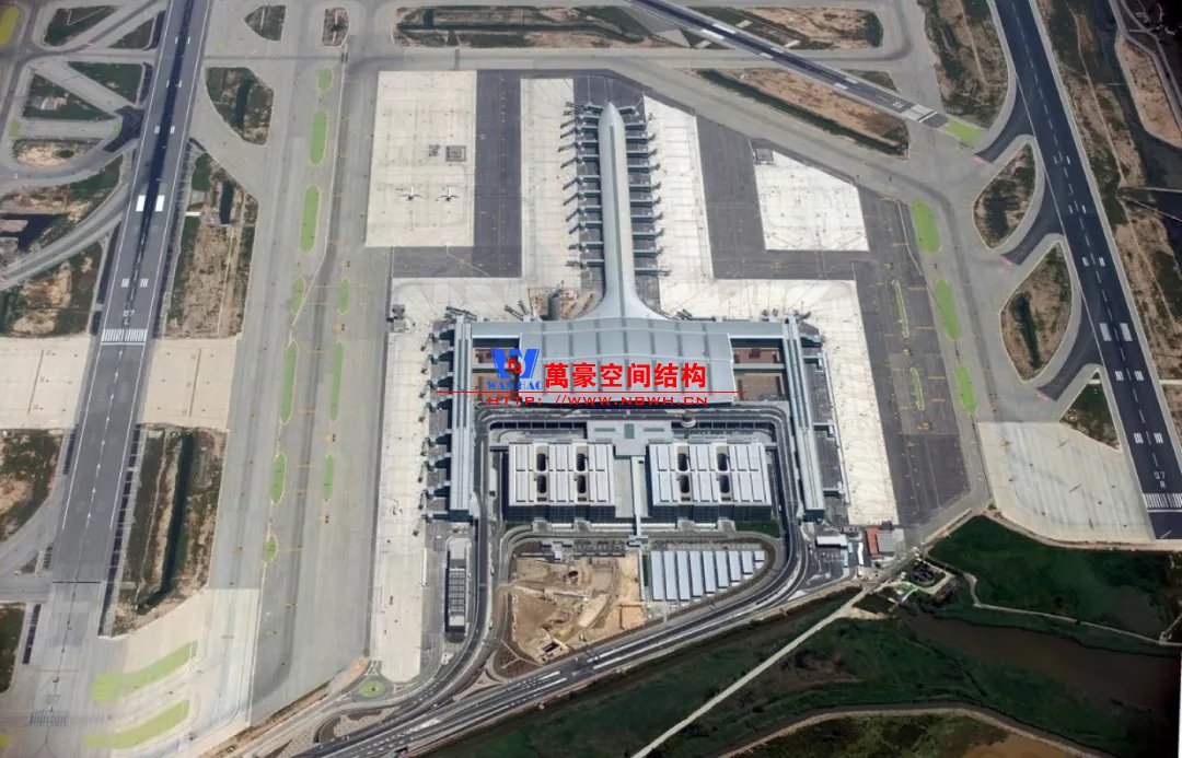 如巴塞羅那機場的指廊就是采用簡單的鋼框架結(jié)構(gòu)體系,鋼柱布置于兩邊;幕墻采用剛性幕墻,貼近鋼柱外側(cè)布置;室內(nèi)吊頂無天窗,吊頂走向沿長向,空間上有指向性。