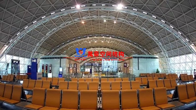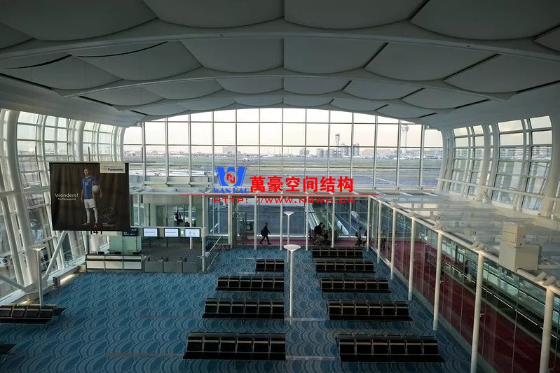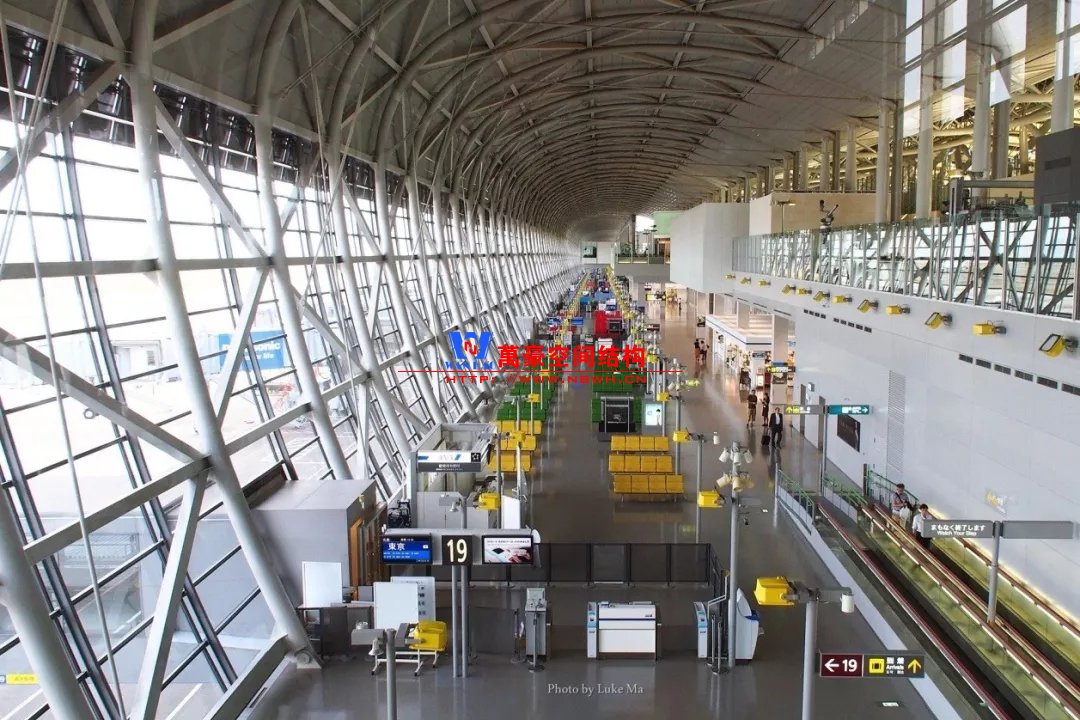大阪關(guān)西機場則采用弧形鋼梁+索的結(jié)構(gòu)體系,有效減小了鋼梁尺寸,同時由于沒有天窗光線作用,鋼索并不明顯。可能是由于日本是地震多發(fā)地區(qū),外露的支撐構(gòu)件比較多略顯雜亂。