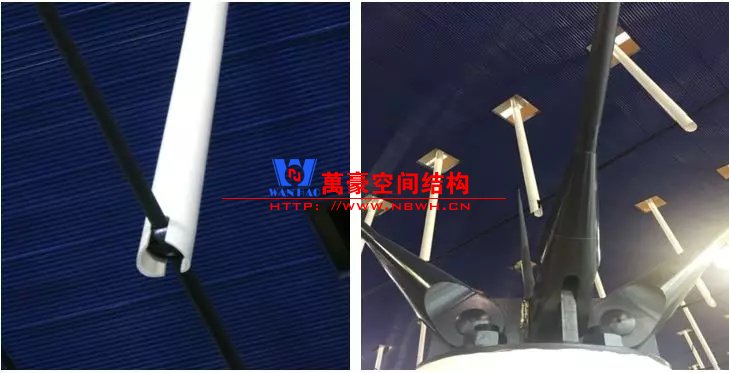 為了豐富室內(nèi)空間,建筑師還增加很多小細節(jié)。比如室內(nèi)柱子的顏色是漸變的,這樣沿著指廊前進時就不會顯得那么單調(diào);吊頂并沒有將鋼梁全部包掉,而是露出了鋼梁的下翼緣,這樣就能在遮掉次梁檁條等比較雜亂構(gòu)件的同時表現(xiàn)出結(jié)構(gòu)的肌理,同時由于結(jié)構(gòu)外露,所以結(jié)構(gòu)工程師節(jié)點設(shè)計也很考究;頂部結(jié)構(gòu)比較“硬”,所以幕墻采用了比較“軟”的索桁架半剛性幕墻,立面顯得極為通透。