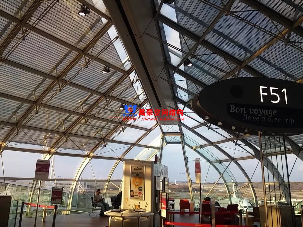 克羅地亞札格瑞布機場剖面也是筒形,結(jié)構(gòu)采用網(wǎng)架結(jié)構(gòu),但網(wǎng)架沒有外包。網(wǎng)架構(gòu)件和網(wǎng)架球節(jié)點直接暴露在近人的尺度,但從照片上看并沒有顯得很雜亂,這可能是因為結(jié)構(gòu)構(gòu)件和節(jié)點的尺度控制的很好,細而密的構(gòu)件顯得比較精細。