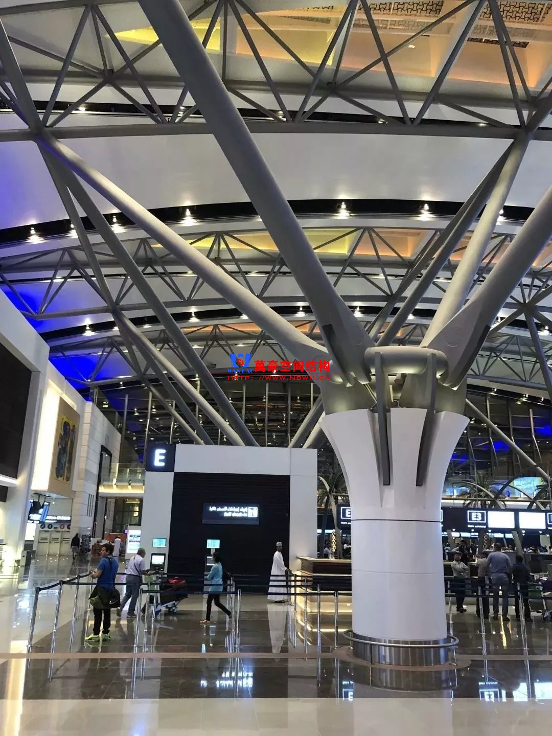 如果室內(nèi)建筑吊頂效果比較特殊,那么空間網(wǎng)格結(jié)構(gòu)更能發(fā)揮其適應(yīng)性強的特點,比如伊斯坦布爾新機場。室內(nèi)是單元式的吊頂曲面比較復(fù)雜,設(shè)計時采用空間交叉桁架結(jié)構(gòu)貼合表皮布置桁架弦桿,同時在桁架之間搭設(shè)次桁架和次梁形成復(fù)雜的吊頂面。通過化整為零的方法,結(jié)構(gòu)建造難度大大降低,最終建筑效果也很好。同時中部混凝土柱承擔(dān)豎向力,立面布置斜撐增加結(jié)構(gòu)的抗側(cè)剛度,兩類柱子在尺度和顏色上形成反差,在視覺上就能感受到結(jié)構(gòu)的邏輯。