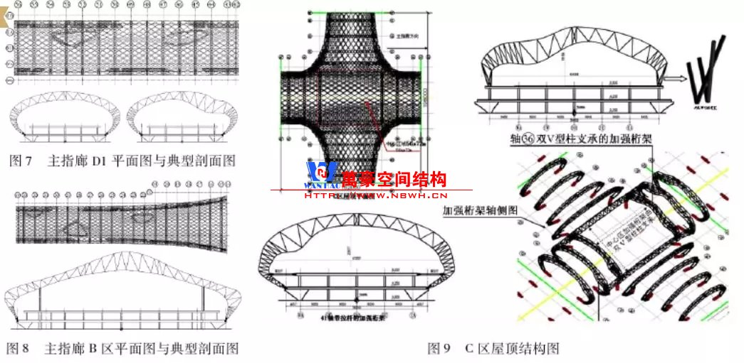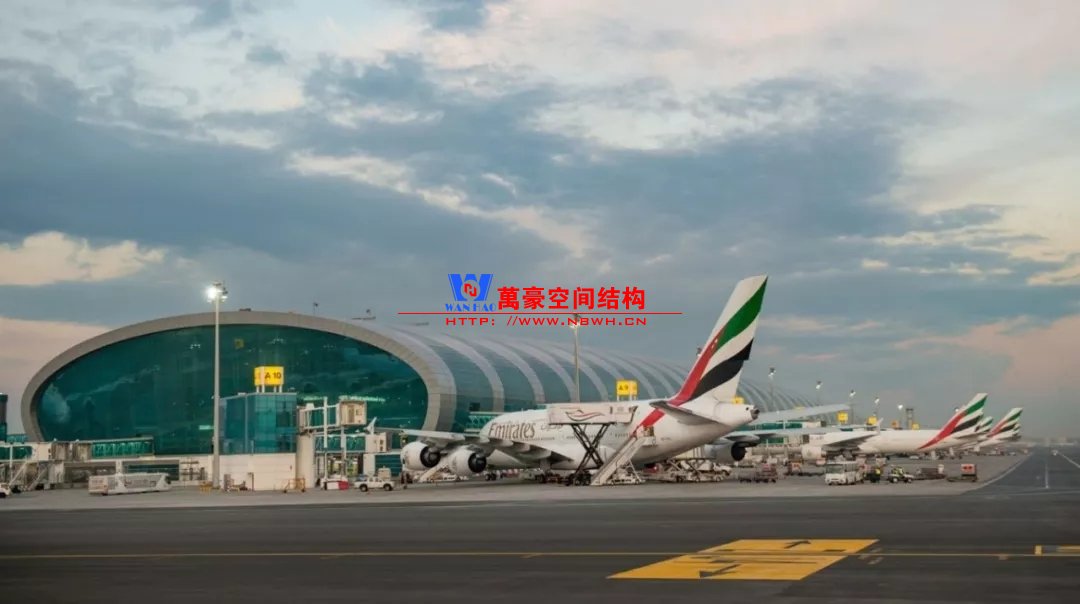 無獨有偶迪拜機場也是采用相似的外形,但是由于剖面并不是一個完整的拱形,因此構(gòu)件內(nèi)彎矩作用會比較明顯,因此在室內(nèi)布置了兩根柱子。立面幕墻則采用索桁架半剛性幕墻立面更加通透。與雙流機場不同,結(jié)構(gòu)構(gòu)件是吊頂外包的,因此外包區(qū)域采用了效率更高的主次梁體系。