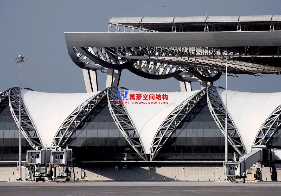 曼谷素萬那普機場同樣的形式設(shè)計出了不同的效果。前面兩個機場在室外是平滑的,而素萬那普機場選擇了空間桁架結(jié)構(gòu),且讓桁架暴露在建筑立面外側(cè),形成建筑表達的一部分。結(jié)構(gòu)體系從剖面上看利用了類似三鉸拱的概念,同時桁架高度與彎矩圖相符。立面則選用了剛性幕墻,整個建筑表達出了結(jié)構(gòu)的力度感。