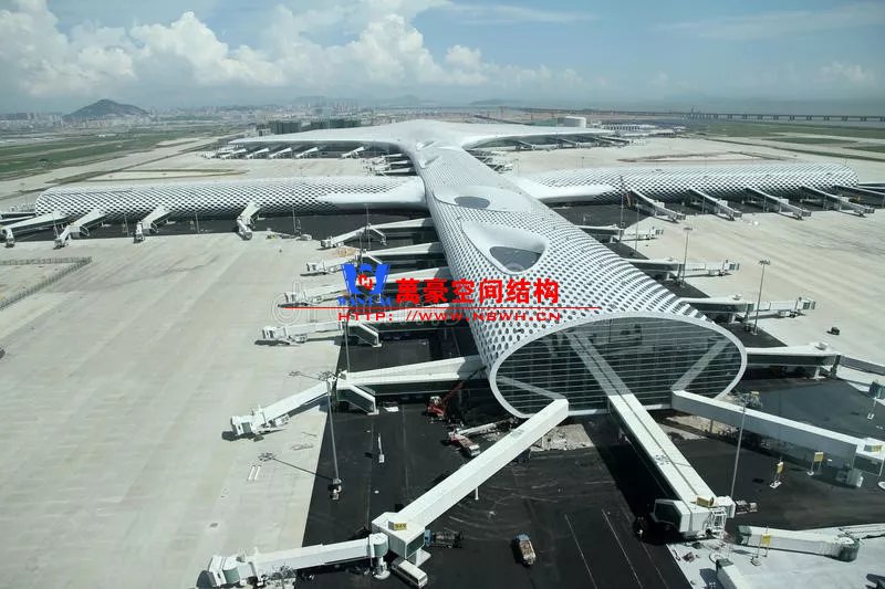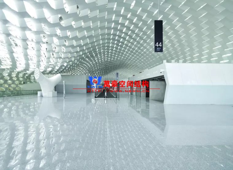 當(dāng)然也可以用萬能的桁架和網(wǎng)架去擬合筒形的曲面,但建筑的不同處理方法,會讓最終效果呈現(xiàn)出完全不同的感覺。如深圳寶安機場采用桁架+網(wǎng)架的結(jié)構(gòu)體系貼合建筑的上下表皮,最終建筑做吊頂外包,建筑吊頂采用鏤空的形式表達出建筑紋理,但在縫隙中可以看到結(jié)構(gòu)構(gòu)件。