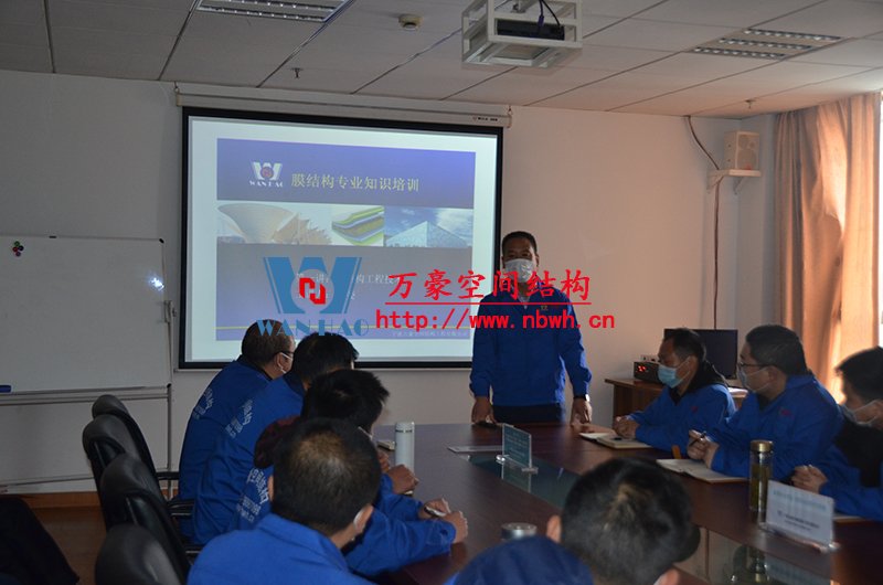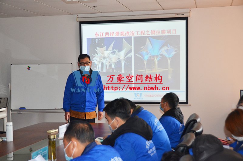 膜結(jié)構(gòu)專業(yè)知識(shí)宣講會(huì)在萬(wàn)豪空間結(jié)構(gòu)公司會(huì)議室進(jìn)行,培訓(xùn)內(nèi)容由萬(wàn)豪總經(jīng)理張總及工程部各項(xiàng)目經(jīng)理進(jìn)行主講。