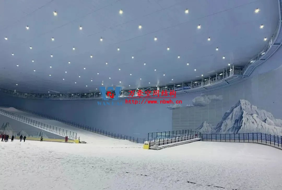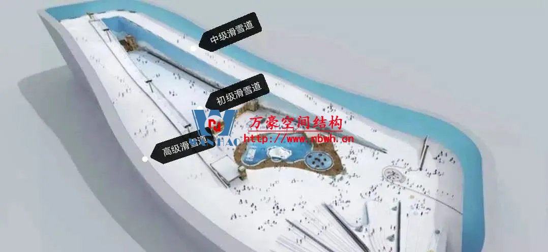 水雪綜合體用鋼量達(dá)到2.4萬噸,雪世界最長滑雪道有320米,垂直落差達(dá)60米,相當(dāng)于20層樓高。