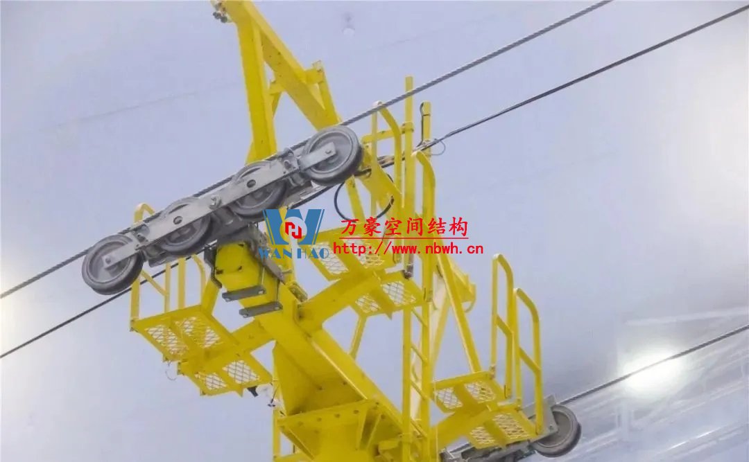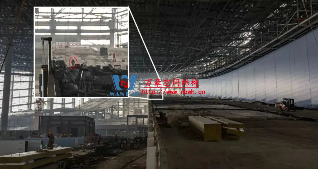 水雪綜合體高中低三區(qū)屋蓋,需要采用不同的安裝方式。低區(qū)屋蓋直接在地面拼裝,然后再吊裝就位;中區(qū)屋蓋需要采用原位拼裝+整體累計(jì)提升的方式;高區(qū)屋蓋則采用累積滑移+局部提升的方式,沿滑雪道布置兩條大滑梯,地面拼裝后再將鋼材部件順著滑梯滑上去,到達(dá)固定位置時(shí)對接安裝好完成。