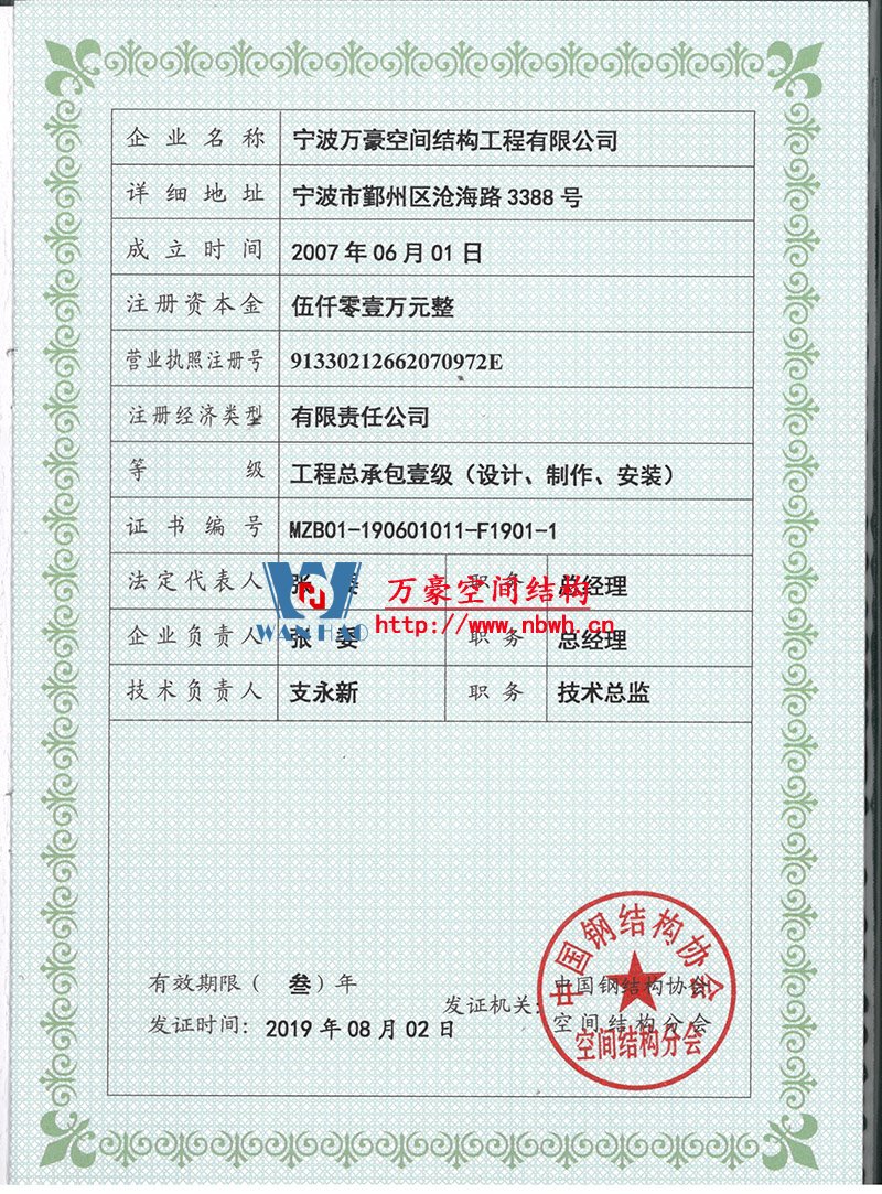 • 膜結構工程總承包特級(設計、制作、安裝)資質,鋼結構工程二級資質