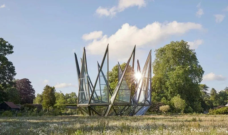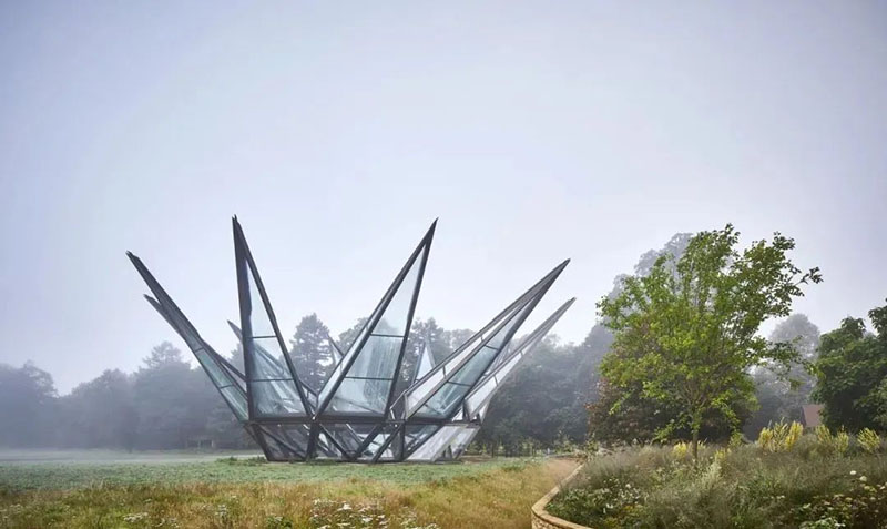 溫室結構高度為15米,占地面積143平方米,可展開的結構成為新花園的焦點,展現出古代絲綢之路對當今英國花園的影響,由十個玻璃和鋁結構的“萼片”組成,展開時間為四分鐘,形成了大型皇冠形空間。該動力溫室的設計靈感來自維多利亞時代的觀賞玻璃容器,強調通過“將當代發明織入歷史語境,繼而擁有讓彼此對話的信心”的方式來紀念過去。該溫室本身保存著稀有的 Aralia Vietnamensis 標本,它為傘形樹、木蘭和香蕉旁生長的蕨類植物提供遮蔭。該裝置的工程設計提供了功能性的保護結構,同時為全新的絲綢花園提供了獨特的裝飾元素。其“萼片”可通過液壓機打開,使植物獲得陽光和通風;而在寒冷的天氣之中,該結構則會保持閉合,為所藏的亞熱帶物種提供庇護。伍爾貝丁的動力溫室和絲路花園現于 2022年4月28日至9月30日期間的每周四和周五面向公眾開放。