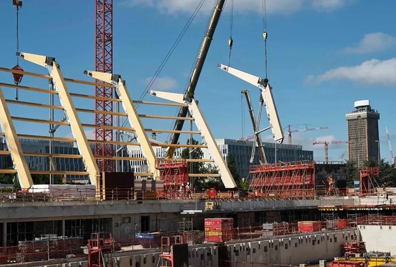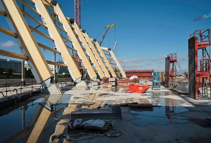 20 根預(yù)制主體木撐桿高 15 至 20 米,重 17 至 23 噸。解決了橫跨 90 米的大跨度的問(wèn)題,構(gòu)成了令人印象深刻的木制勁性懸索結(jié)構(gòu)。