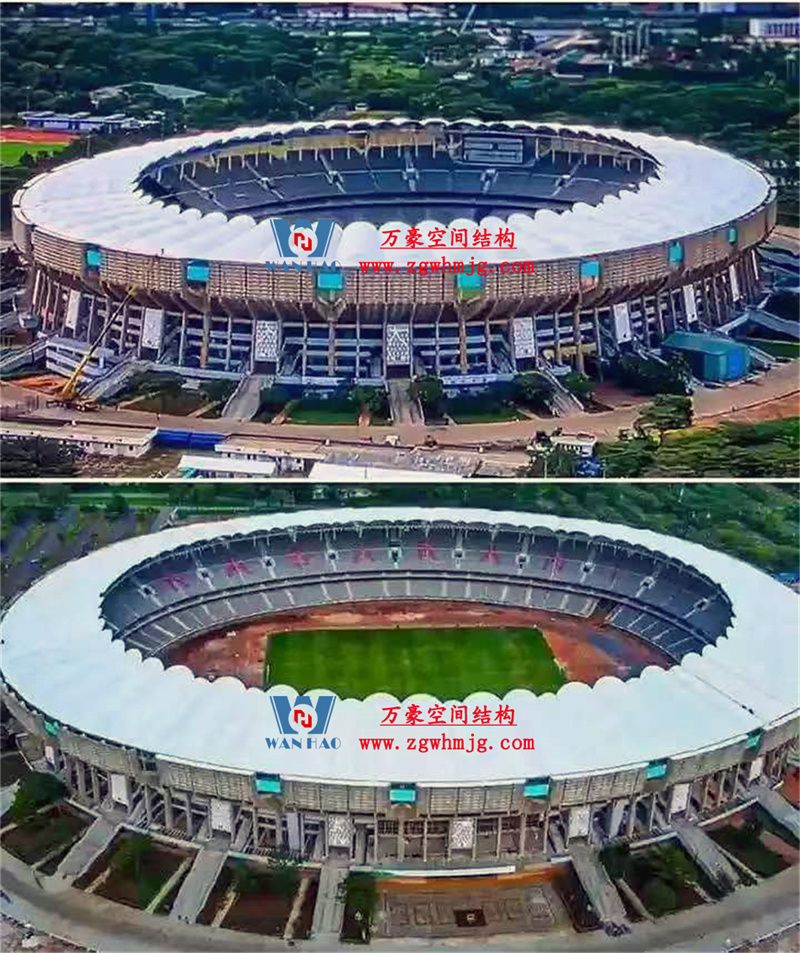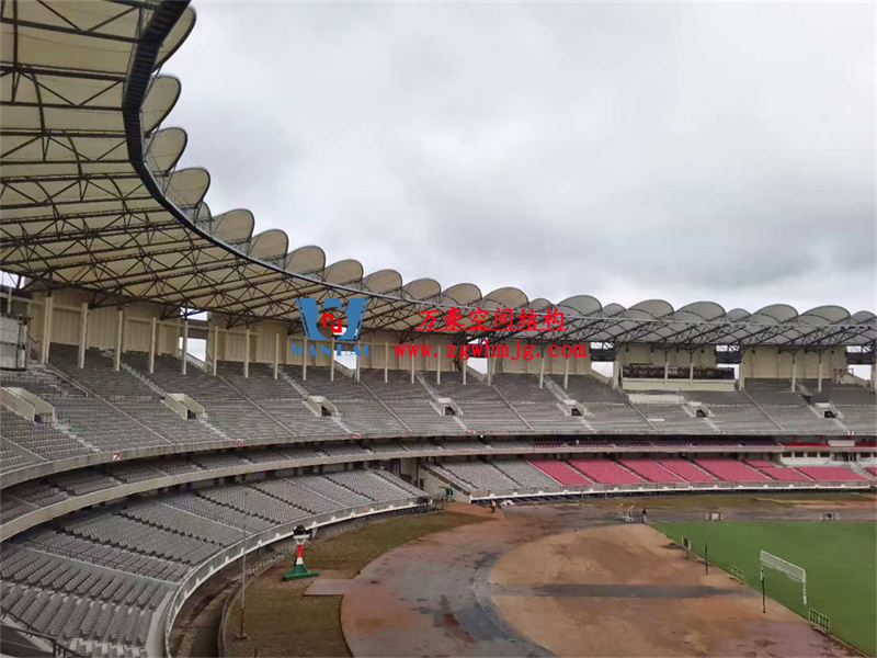 容納3萬人肯尼亞內羅畢(非洲杯)足球體育場,屬于整體性改擴建項目,因體育場投入使用30余年,原設施落后陳舊,改造設計要求充分考慮原基礎結構安全。項目前期需要進行基礎立柱定位,結構屋面拆除等相關工作,并通過科學有效的技術措施處理,3D掃描,健康檢測,建模分析等,經過多輪方案比選后,最終選擇PTFE膜屋面大懸挑空間結構。主體桁架懸挑45米,橫向聯系向上起拱,屋面采用高自潔PTFE膜結構,開口式體育場內部視野空曠無遮擋,讓非洲人民足球夢想在這里展翅高飛。該項目作為2026年非洲杯足球賽體育場之一投入使用,改擴建設計生產施工全部由萬豪團隊完成,充分體現了萬豪的設計施工服務能力,也為海外市場的拓展奠定了扎實的基礎。