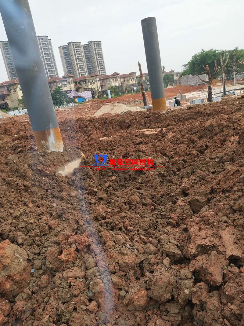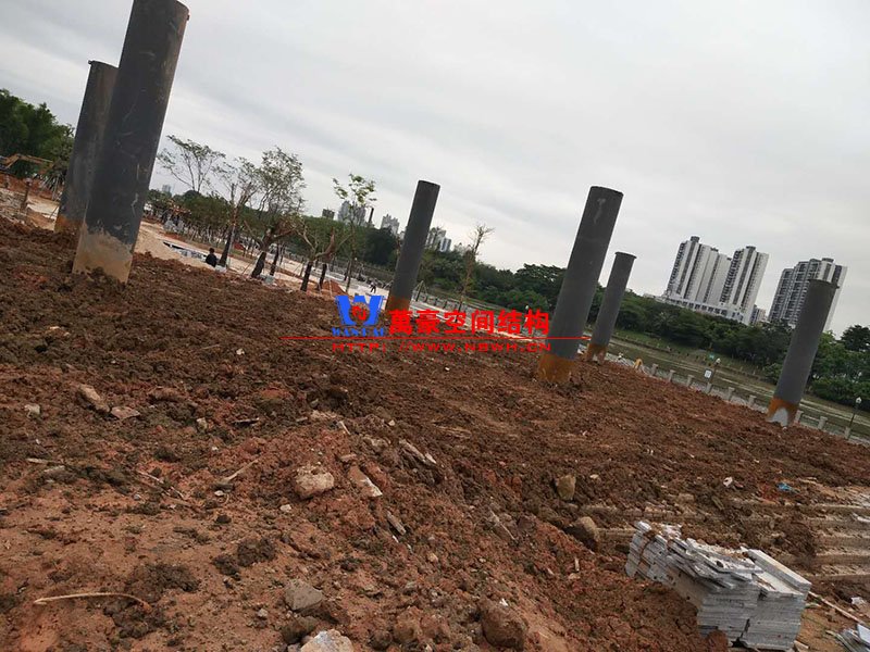 廣場鋼拉膜項目由六個龍船花造形景觀組成,每個龍船花景觀造形立柱的高度不得低于3.80米,花瓣造形最低高度 7.54米,花瓣造形最高高度9.608米,膜結構屋面材質為 PTFE網格基布雙面貼透明ETFE建筑膜材。目前立柱已安裝完成,準備開始安裝其它構件。