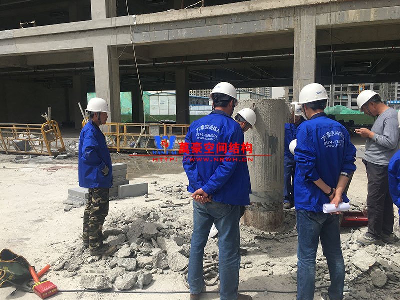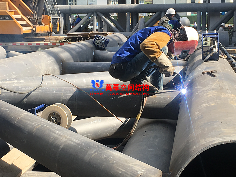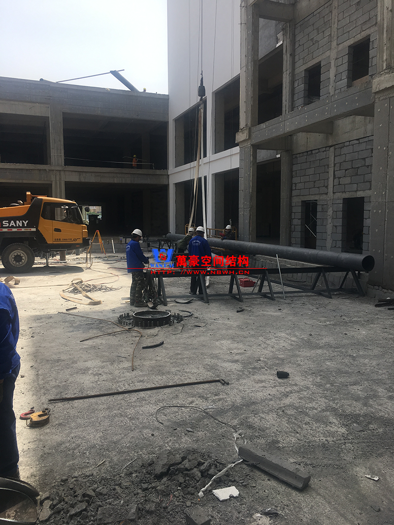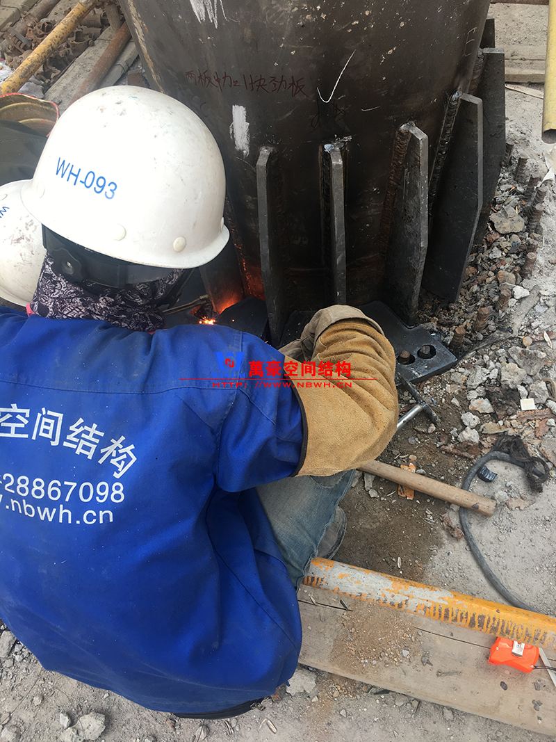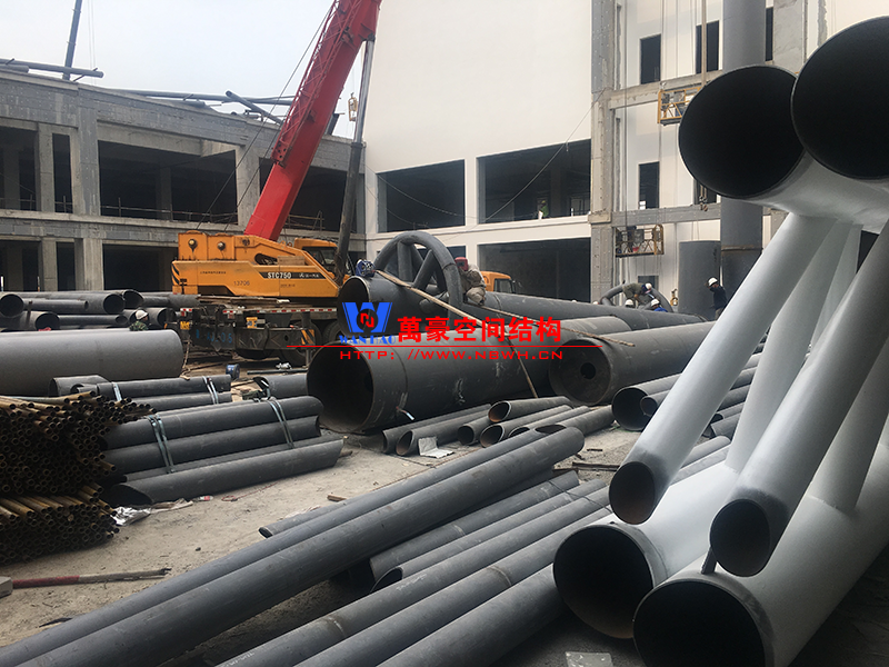 目前一號(hào)云朵鋼柱立起3根,懸挑管架全部拼裝完畢,桁架拼裝完成;二號(hào)云朵鋼柱立起3根,桁架、漏斗已基本到位,懸挑構(gòu)件焊接中;三號(hào)云朵鋼柱焊接中,隔板、環(huán)板正在有序拼裝。
