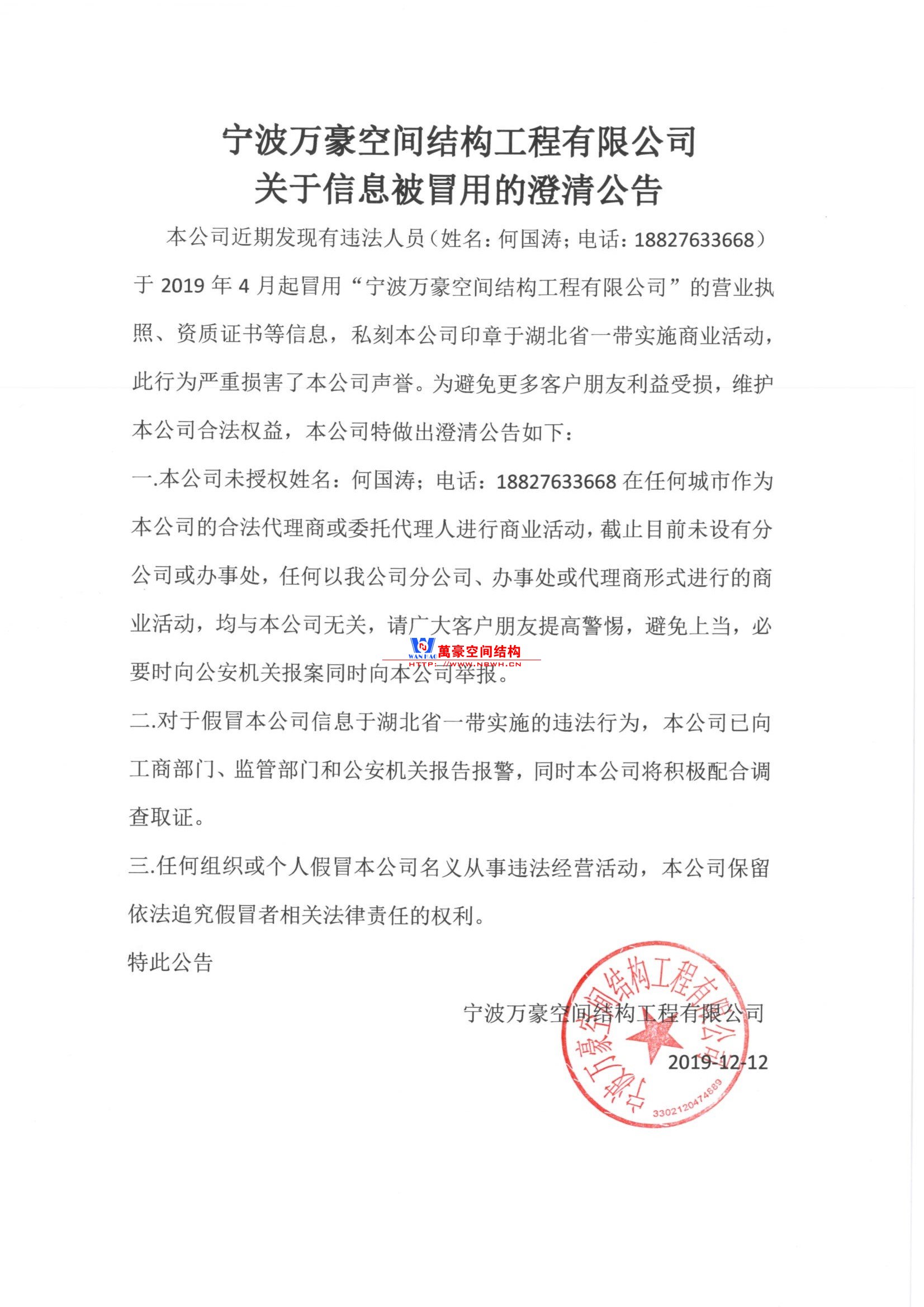 寧波萬豪空間結構工程有限公司關于信息被冒用的澄清公告