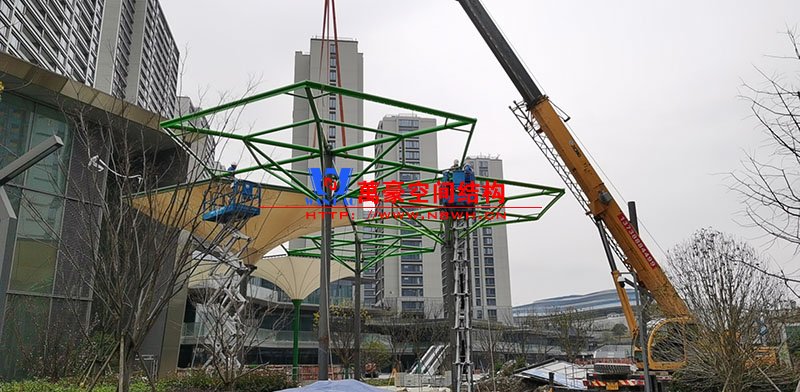 五鄉地鐵站傘狀PTFE膜結構工程位于浙江省寧波市楊柳郡,項目由19座倒傘膜結構組成,倒傘寓意盛開的牽牛花。 該項目膜材使用進口PTFE膜材,膜結構展開面積5000平米,用鋼量100噸,由寧波萬豪空間結構工程有限公司承建。 目前,鋼結構施工進入白熱化階段。期待整個工程的完工,來領略它獨特的風采。