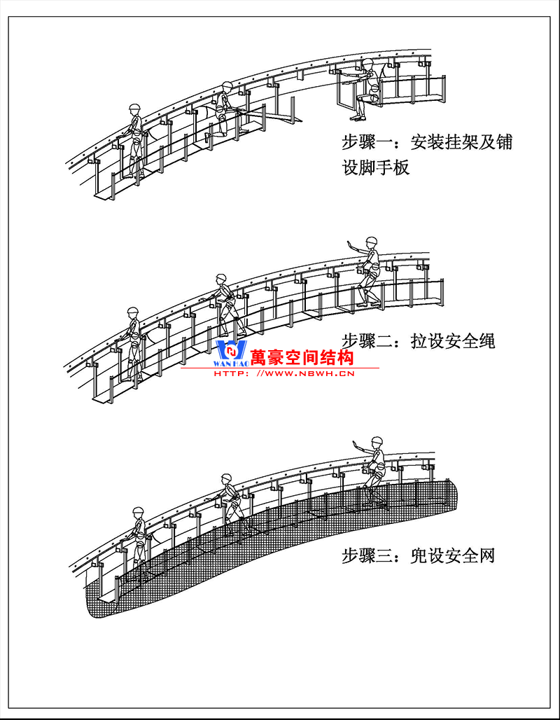 本工程主體結(jié)構(gòu)高,致使膜結(jié)構(gòu)的安裝不得不在高空進(jìn)行,同時針對現(xiàn)場作業(yè)條件我司考慮使用懸掛腳手架的方案。焊接式掛架利用端部的掛鉤直接懸掛在鋼結(jié)構(gòu)連接板的位置。焊接式掛架現(xiàn)場安裝時必須保證掛架與地面垂直,掛架內(nèi)、外兩側(cè)各設(shè)安全防護(hù)繩, 每隔五個掛架拉一對防晃纖繩與二次部材筋板拉結(jié),防止擺動。