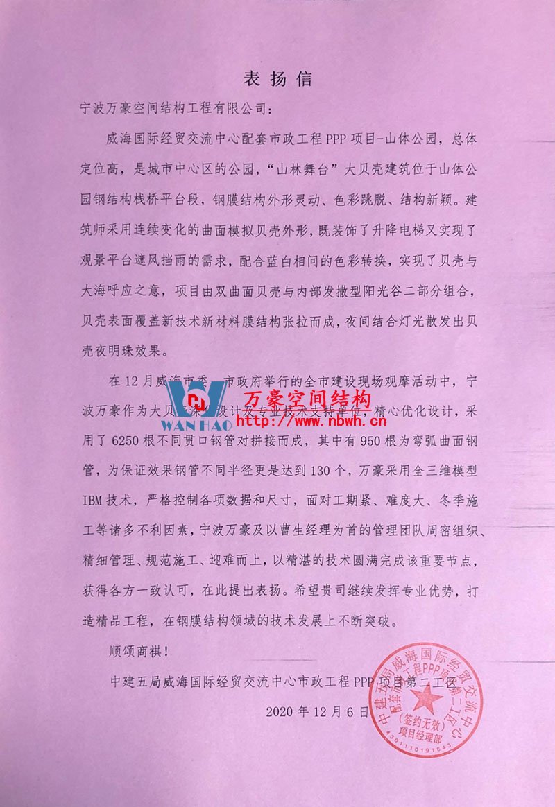 特此中建五局威海國際經(jīng)貿(mào)交流中心項目部致以感謝信與定制錦旗給與嘉獎。