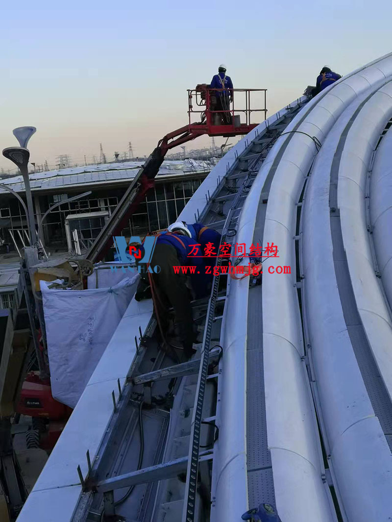 本工程鋼結構為單層雙曲網殼結構體系,平面上為對稱結構,大翅膀長跨約 50m,短跨約 25m,小翅膀長跨約 35m,短跨方向約 15m。建筑頂面為雙曲造型,建筑物最高點標高約17米。總用鋼量800噸,膜體總面積約7000平方米。