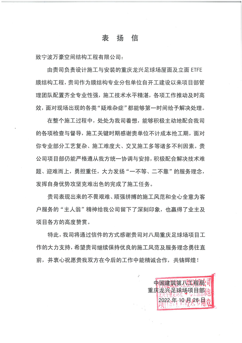 特此,中國建筑第八工程局重慶龍興足球場項(xiàng)目部致以定制錦旗與感謝信給與嘉獎(jiǎng)。