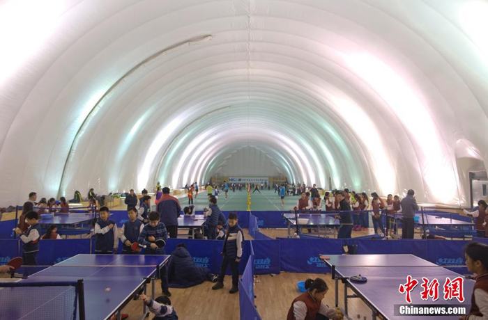 12月1日,一群學生在北京市某學校充氣膜結(jié)構(gòu)體育館學習乒乓球。該體育館的PM2.5過濾系統(tǒng)能夠過濾輸入室內(nèi)的空氣,過濾后的空氣通過風道輸送至充氣膜內(nèi)。充氣膜內(nèi)氣壓大于室外氣壓,可以將PM2.5隔絕在充氣膜館之外。中新社記者 劉關(guān)關(guān) 攝 (來自:中國新聞網(wǎng))