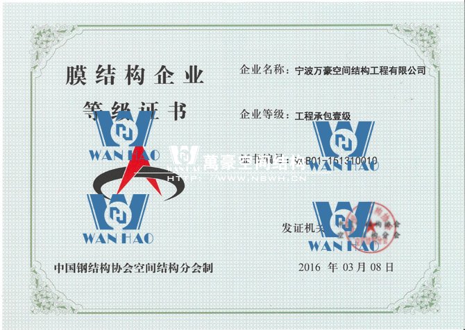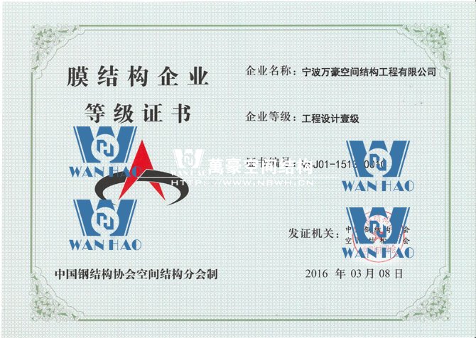 憑借著公司的硬實力,寧波萬豪空間結構工程有限公司在膜結構企業等級會員第十六次評審中榮獲工程承包、專項設計雙一級資質。標志著公司向前更進一步,也是協會對公司實力的認可,公司將不斷努力,為膜結構行業的發展貢獻自己的力量。