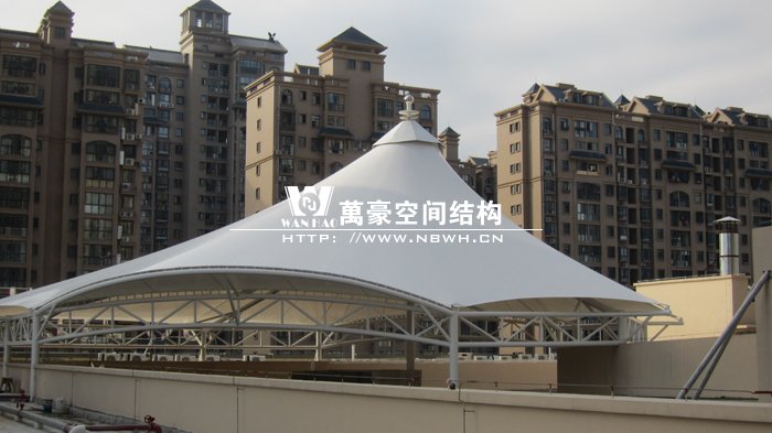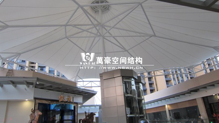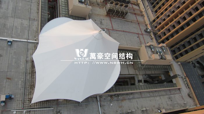 本工程總建筑面積約900平方米,主體一根主柱、九根支柱,四周單片桁架連接,總體一個(gè)帽柱,直線長(zhǎng)為26.9米,帽柱總高33.6米,寬為27.8米。因?yàn)楸竟こ套湓谏虡I(yè)區(qū)中心,四周都是五層商鋪,吊車無法進(jìn)入施工現(xiàn)場(chǎng),先用25噸吊車把材料送到五層樓房頂,后用人工或手拉葫蘆進(jìn)行運(yùn)送和安裝。施工范圍包括鋼結(jié)構(gòu)系統(tǒng)與膜材系統(tǒng)的制作和現(xiàn)場(chǎng)安裝施工,現(xiàn)工程已經(jīng)完工。